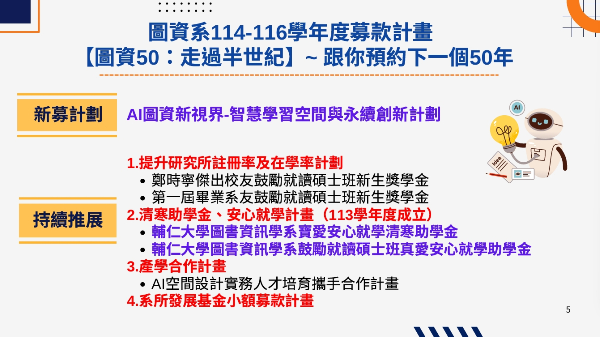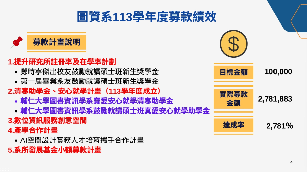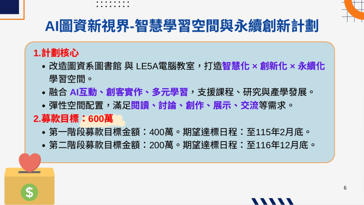 - 經費預估:小額募款,募得款項將運用於圖資系所發展基金之各項規劃,經本系基金管理委員會討論後,審慎使用。