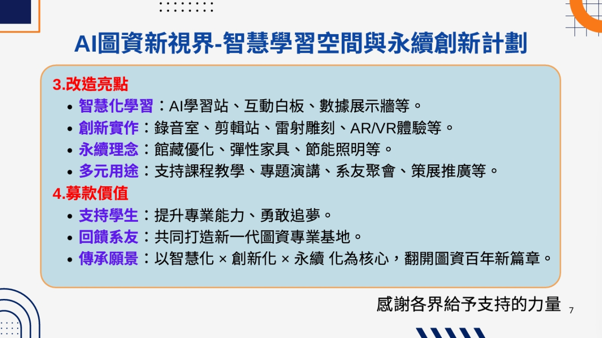 - 做法:首先,將進行需求調查與市場研究,了解現代圖書館空間設計和數位設備佈局的最佳做法。接著,設計空間包括「數位資訊專區」「自主學習空間」及「靜態閱讀區」,並引入人工智慧研究設備、無人自助借還系統與數位自造設備等創新設施,提升學生實務技能。