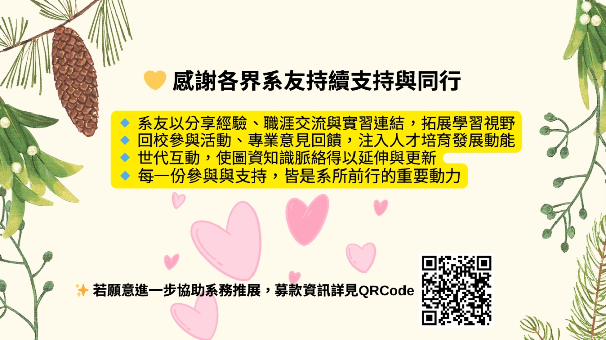3.【系友會長改選登記】:系友會目的在聯絡系有情感,促進彼此合作及發展,協助推廣增進系友情誼之相關活動。系友會長參選人登記時間延長至2020年12月12日,歡迎師長及同學們推薦有意願當家爸或家媽的系友,歡迎有服務熱枕、有理想抱負的系友們加入圖資系友會的行列。